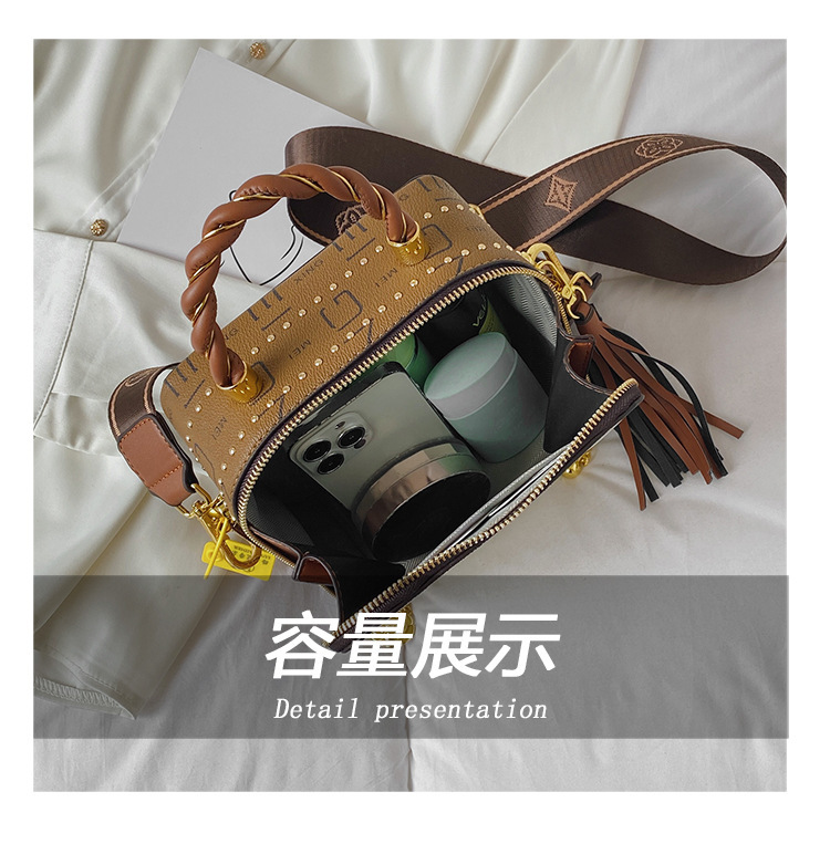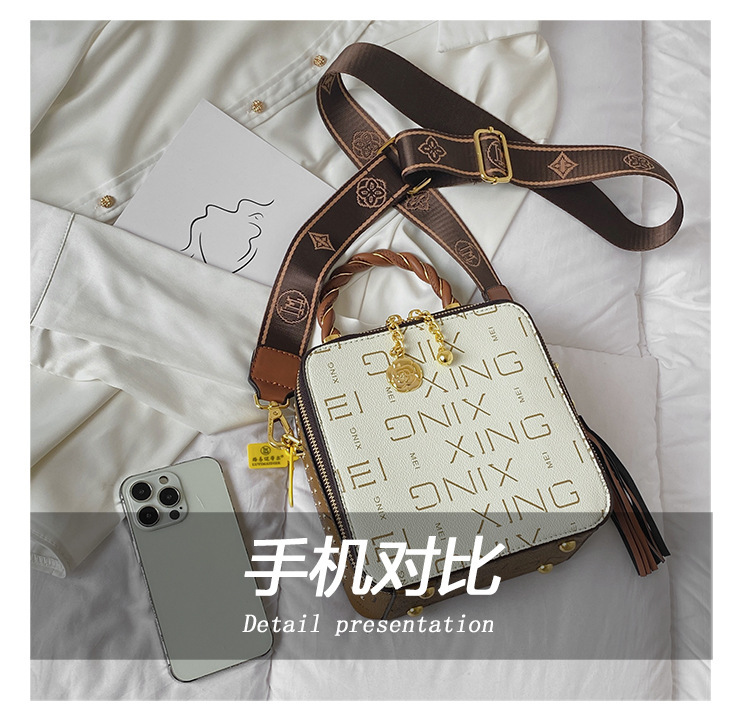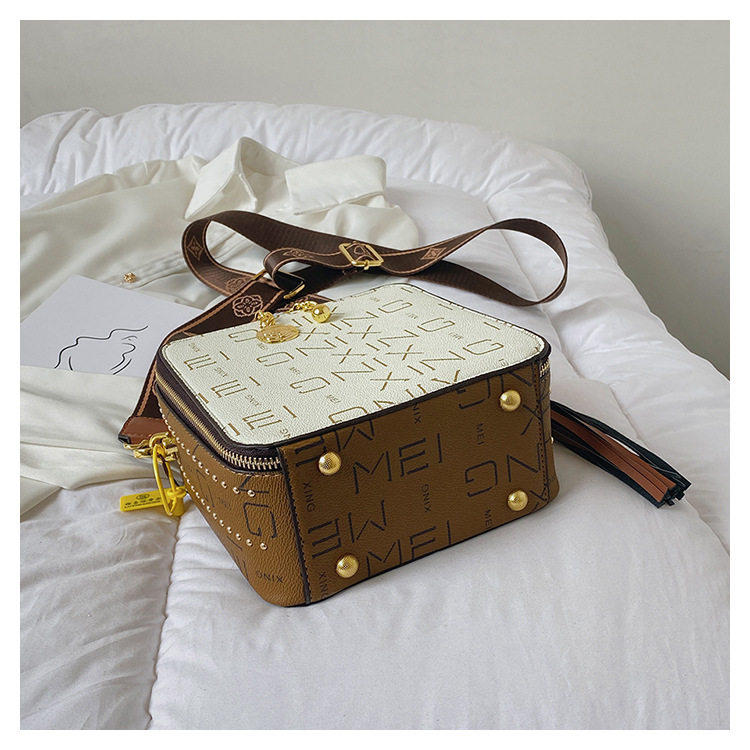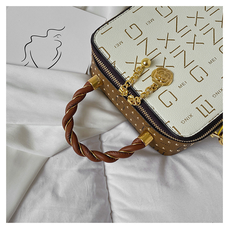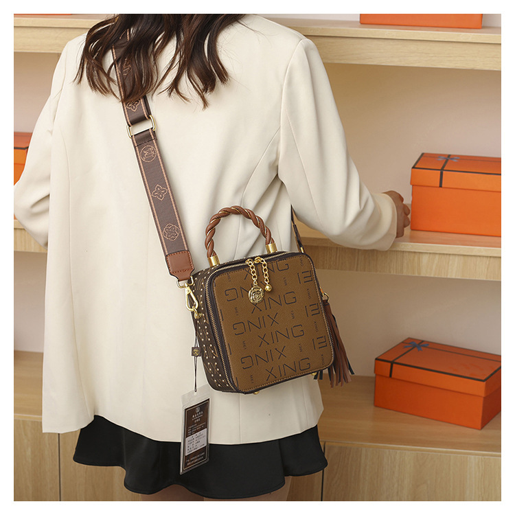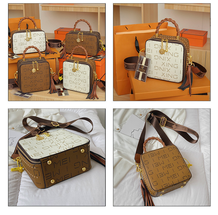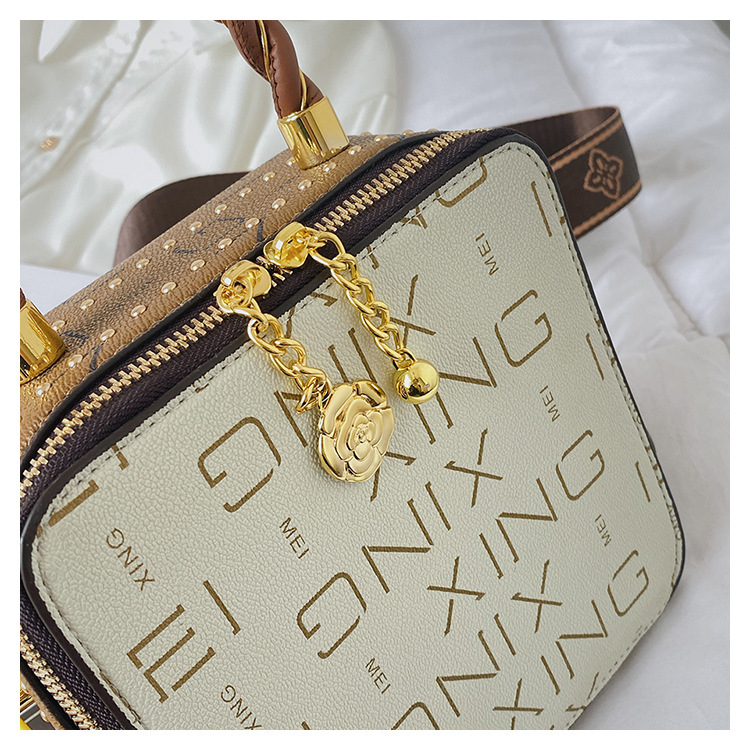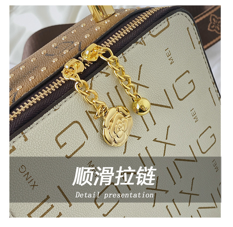 跨境女包2023秋季新款双面印花铆钉老花拉链盒子手提单肩斜挎女包